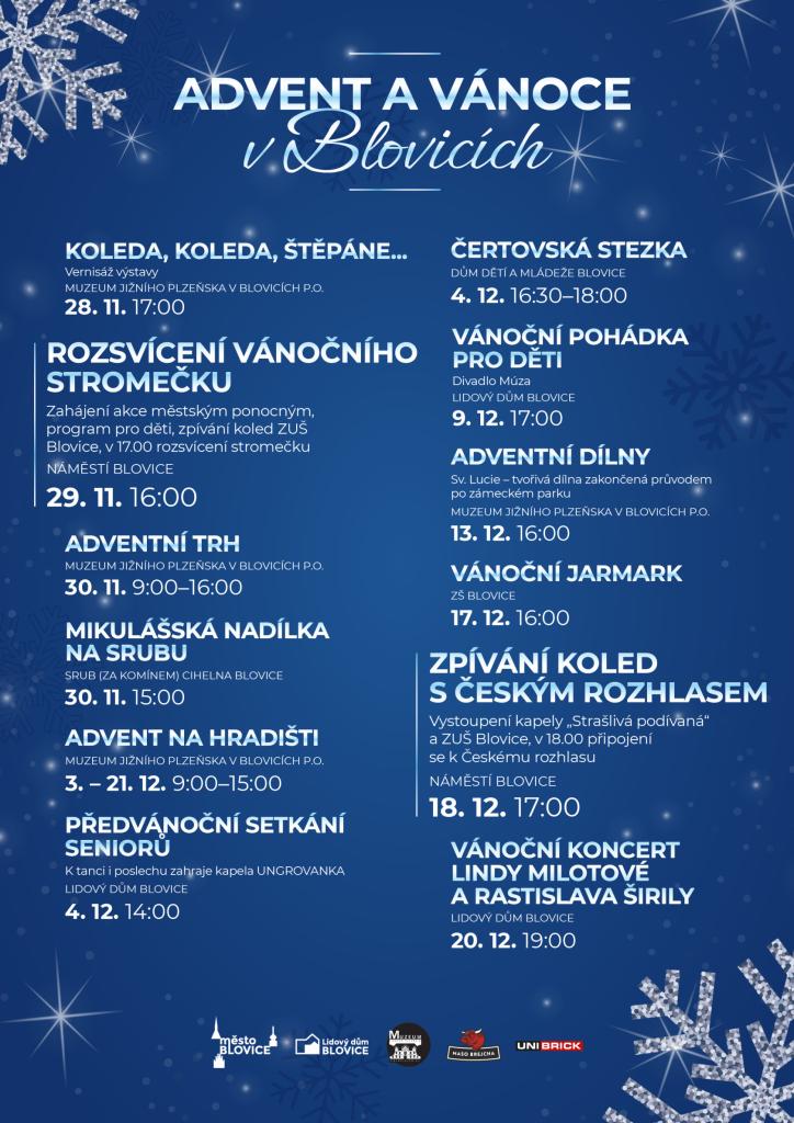Vážení Blovičáci, přinášíme vám přehled hlavních kulturních akcí, které budou v době adventu, tj. od 28. listopadu do 20. prosince uspořádány v Blovicích. Sledujte prosím webové stránky města, kde mohou být další akce od ostatních pořadatelů. Největší akcí bude tradičně Rozsvícení vánočního stromečku a Zpívání koled s Českým rozhlasem s bohatým kulturním programem a občerstvením zdarma. Obě akce budou uskutečněny na Masarykově náměstí.