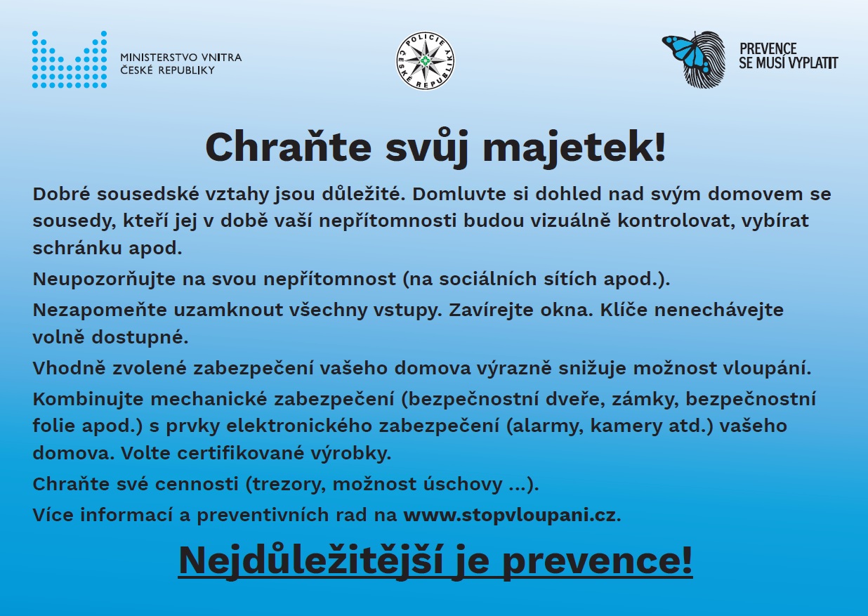 Tato trestná činnost stále patří mezi ty nejpočetnější. Na zabezpečení obydlí je třeba neustále myslet, protože pachatelé dokáží využít jak toho, že jste odjeli na dovolenou, tak i toho, že jste si odskočili třeba jen do restaurace nebo na nákup. Zabezpečení je nejen o technických opatřeních, ale zejména o našem běžném chování a zvycích.