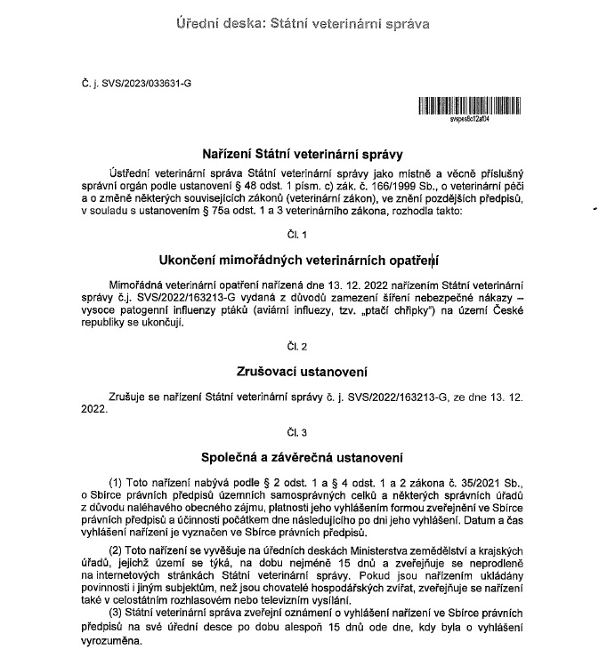 Zrušuje se nařízení Státní veterinární správy č. j. SVS/2022/163213-G, ze dne 13. 12.2022