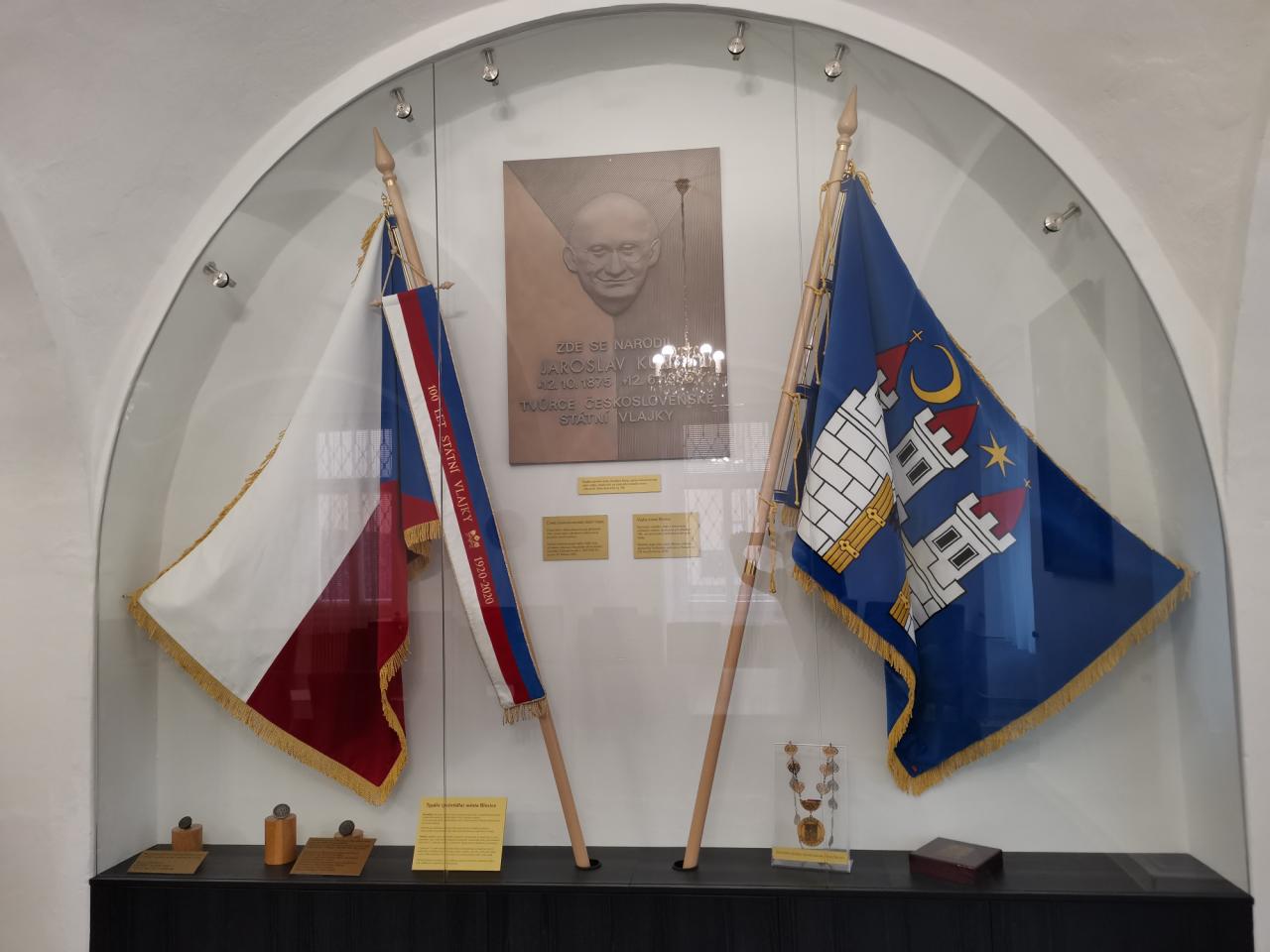 V zasedací místnosti na blovické radnici máme trvale vyvěšeny slavnostní symboly. Jedná se o nově pořízený originál československé, později české státní vlajky, jejímž autorem byl blovický rodák Jaroslav Kursa. Dále je zde vystavena slavnostní ručně vyšitá městská vlajka s historickým městským znakem, udělená městu Blovice předsedou poslanecké sněmovny PČR 26.6.2008. Uprostřed vitríny je replika pamětní desky z objektu Americká 88, kde se Jaroslav Kursa narodil. Zajímavým exponátem je nově pořízený závěsný odznak starosty města, pořízený ke 100. výročí čs.vlajky a dále historická pečetidla s městským znakem. Expozice byla realizována blovickou firmou ARTEO CZ s.r.o., a byla dokončena 12.října - v den výročí narození našeho slavného rodáka Jaroslava Kursy.