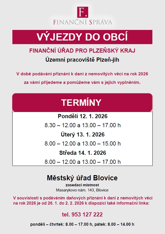 Pracovníci Finanční správy budou počátkem ledna úřadovat v Blovicích