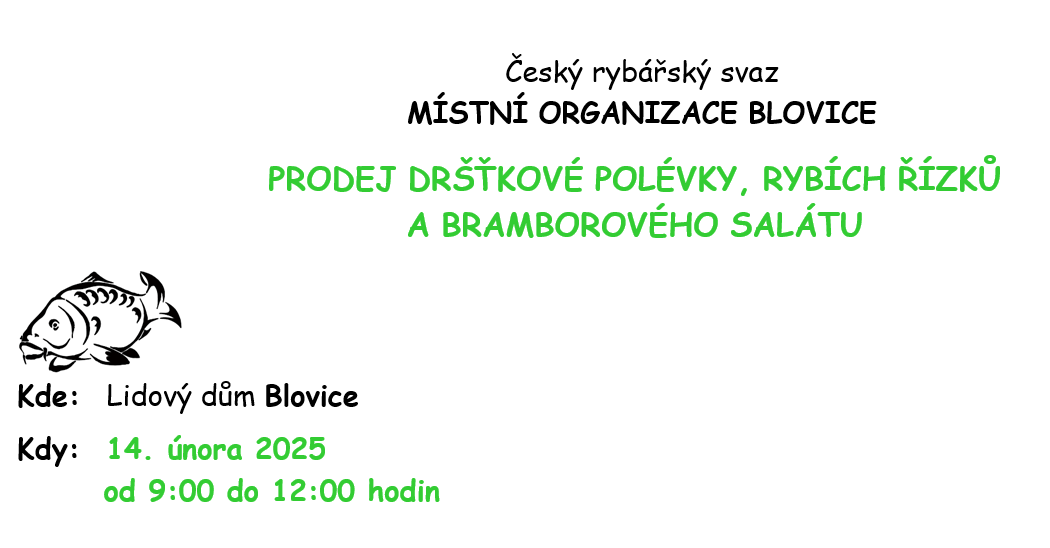 Místní organizace Českého rybářského svazu a město Blovice vás srdečně zvou na tradiční prodej dršťkové polévky a rybích řízků s bramborovým salátem, který se uskuteční v pátek 14. února. Akce proběhne od 9:00 do 12:00 v podsálí Lidového domu v Blovicích. Kromě možnosti pochutnat si na oblíbených rybích specialitách budou mít návštěvníci jedinečnou příležitost prohlédnout si nově zrekonstruované prostory „podsvětí“.