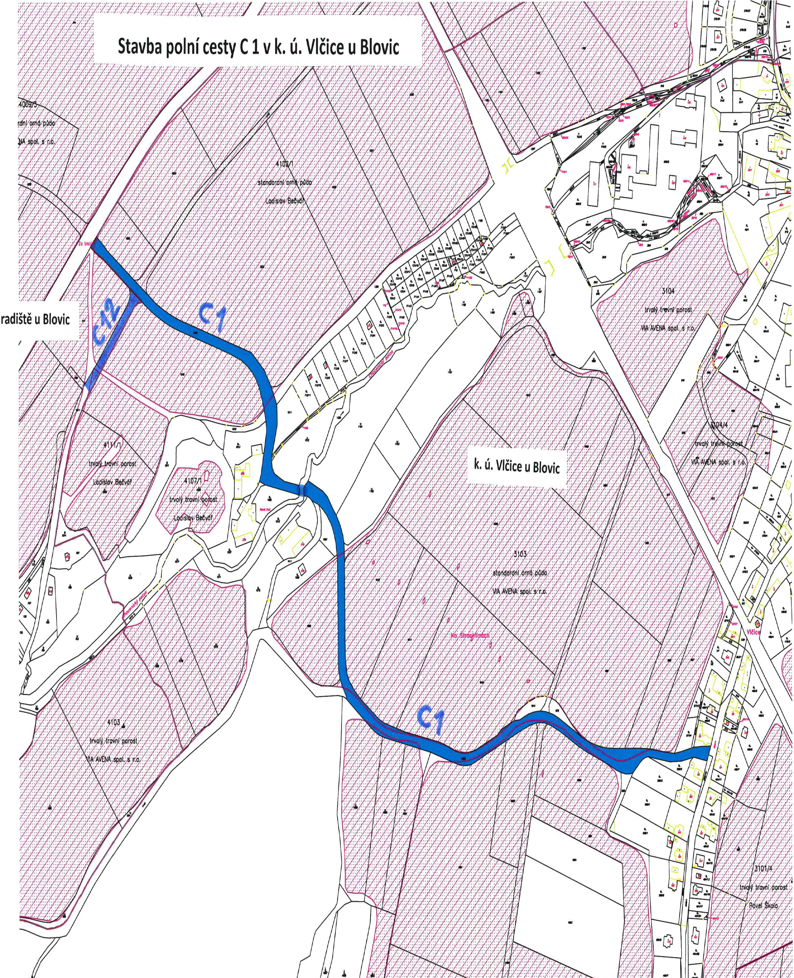 Informujeme občany, že Státní pozemkový úřad ČR započal přípravu na realizaci nové polní asfaltové cesty C1. V současné době probíhá výběrové řízení na zhotovitele. Pracovníci města Blovice provádí pro objednatele nezbytné vymýcení porostů v lokalitě Vlčice - Nová Huť, a to v době vegetačního klidu. Nová cesta je realizována v rámci společných opatření vycházejících z realizovaných komplexních pozemkových úprav v k.ú.Vlčice u Blovic. Vznikne tak komunikace přímo spojující Poplužní ulici, překlene v nové nivelitě údolí Chocenického potoka v Nové Huti a napojí se na těleso stávající polní cesty do Vlčic. Realizace této stavby má být v letošním roce. Informace k výstavbě: p.Velkoborský, e-mail: p.velkoborsky@spucr.cz