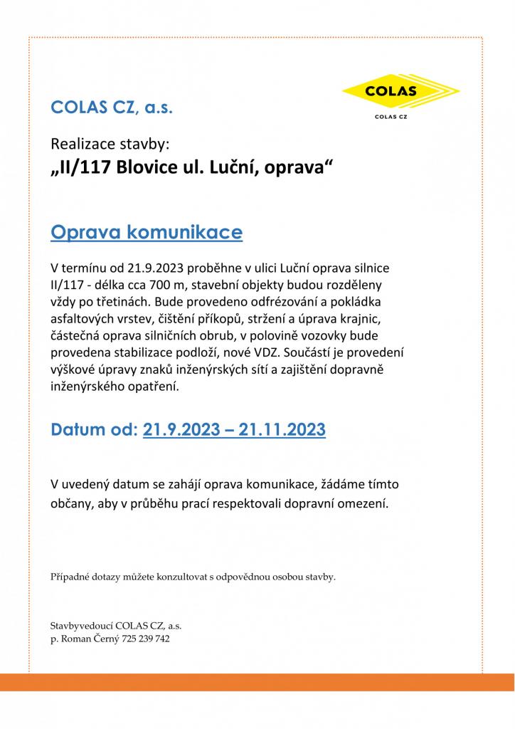 Oznamujeme, že od 21.9.2023 do 21.11.2023 bude probíhat celoplošná úprava Luční ulice v Blovicích. Objednatelem akce je SÚSPK a zhotovitelem společnost COLAS CZ s.r.o. Případné dotazy směrujte a stavbyvedoucího p. Romana Černého, tel. 725 239 742.