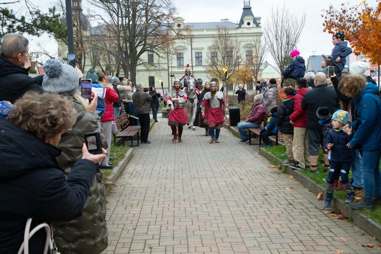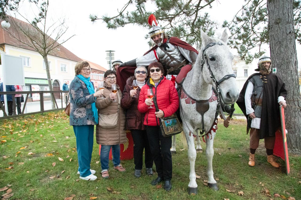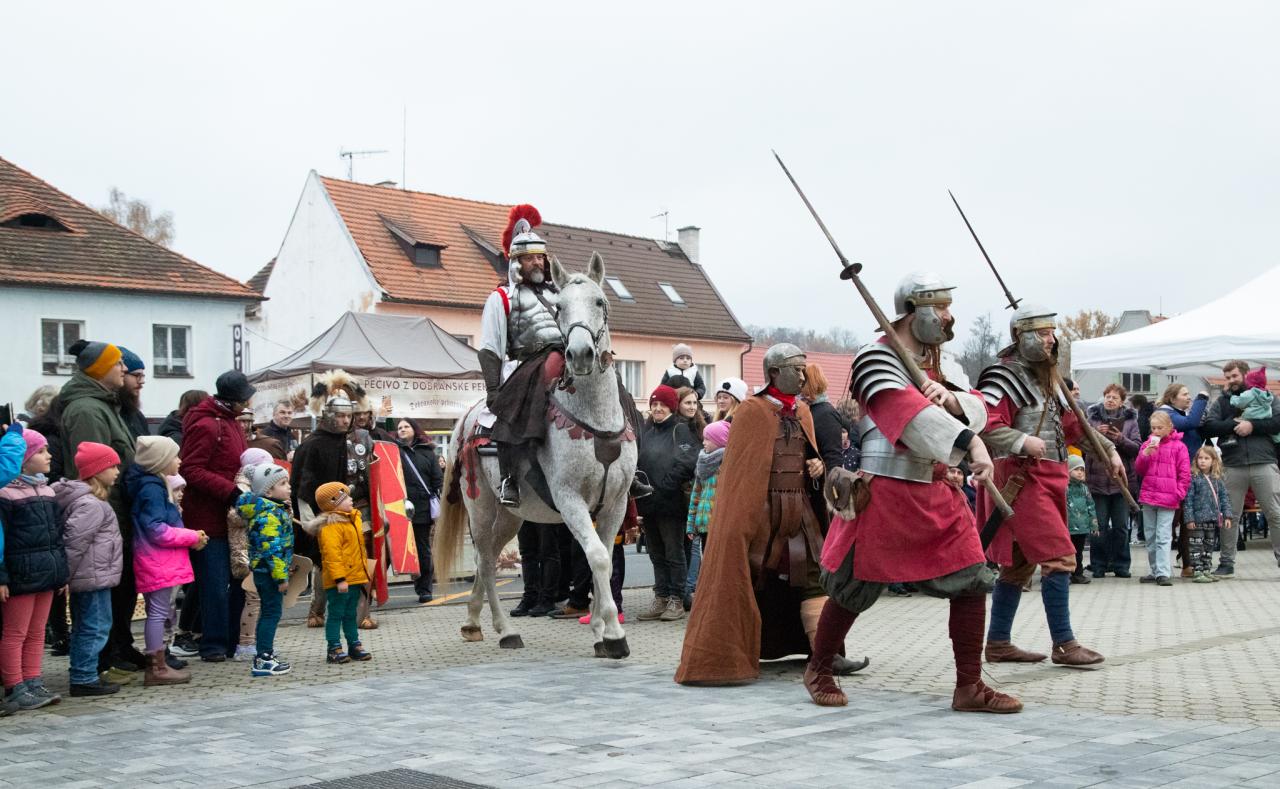 Atmosféru dokreslila dobová kapela Turdus Musikus, a zlatým hřebem odpoledne byl hlavně pro děti příjezd sv. Martina na bílém koni s družinou římských vojáků v podání Rytířů Koruny České. Ti nás také provedli komentovanou scénkou o životě sv. Martina.