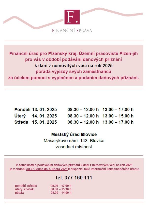 Finanční úřad pro Plzeňský kraj, Územní pracoviště Plzeň-jih pro vás v období podávání daňových přiznání k dani z nemovitých věcí na rok 2025 pořádá výjezdy svých zaměstnanců za účelem pomoci s vyplněním a podáním daňových přiznání.