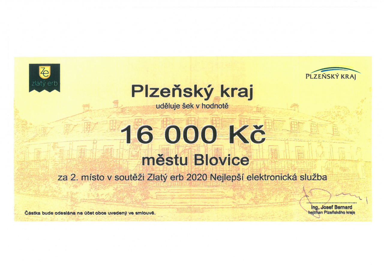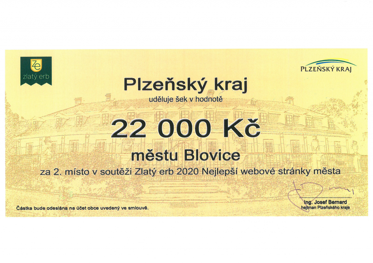 Město Blovice uspělo v krajském kole soutěže Zlatý erb 2020 - soutěž o nejlepší webové stránky města a obcí. V kategorii měst Plzeňského kraje jsme získali druhé místo, rovněž jsme byli druzí v nové elektronické službě pro občany. Byli jsme oceněni částkou 38 tisíc Kč, kterou věnujeme na vylepšení elektronické komunikace města Blovice.