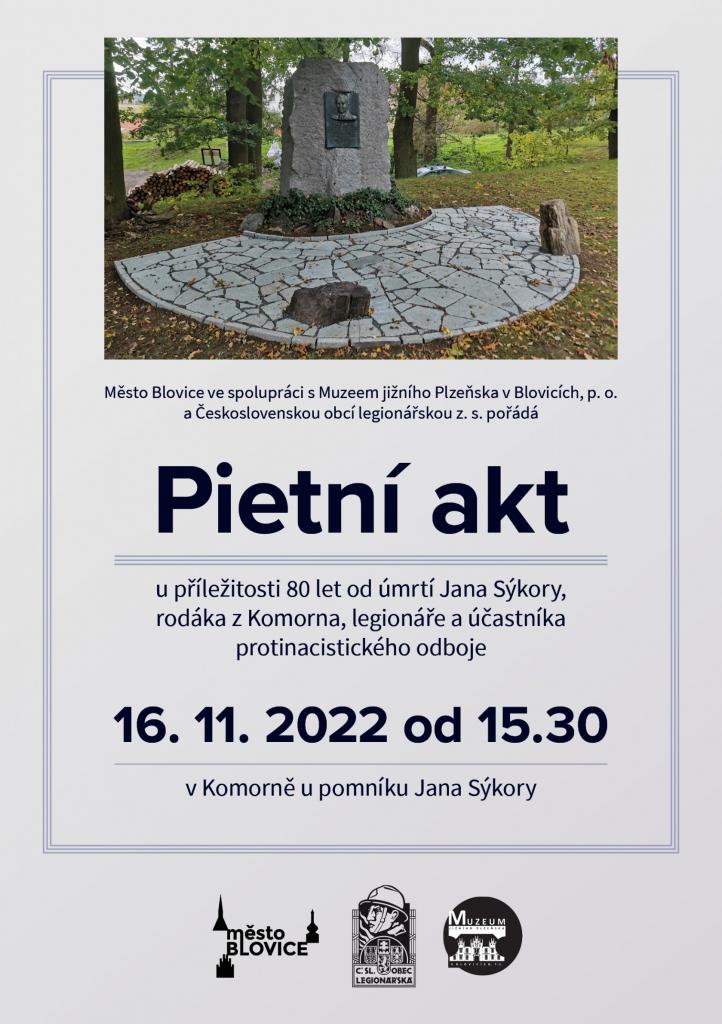Pietní akt se koná u příležitosti 80 let od úmrtí Jana Sýkory, rodáka z Komorna, legionáře a účastníka protinacistického odboje.
