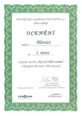 Město Blovice získalo ocenění za 1. místo v krajské soutěži "My už třídit umíme" v kategorii obcí nad 1000 byvatel.