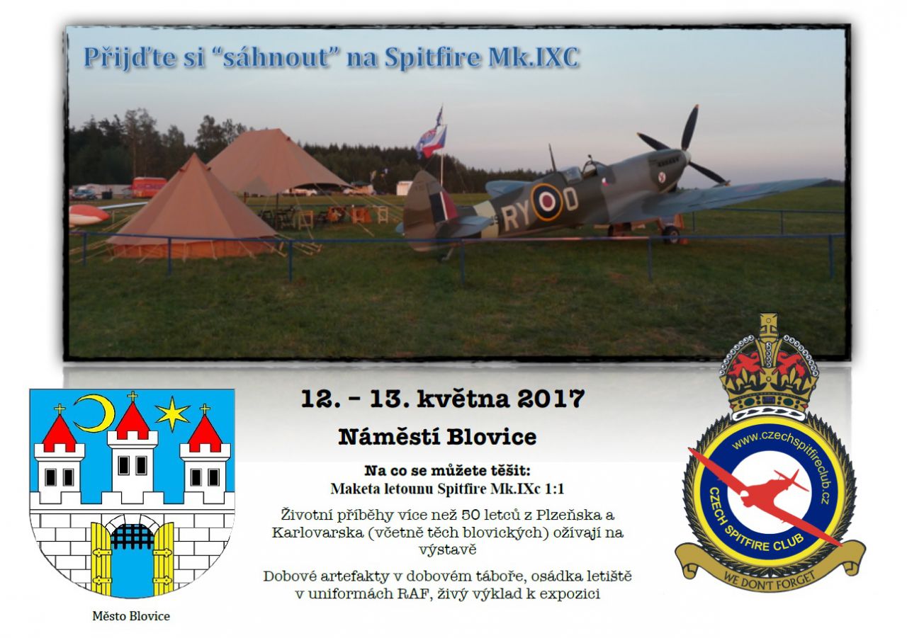 Město Blovice ve spolupráci s klubem vojenské historie Czech Spitfire Club představí unikátní výstavu věnovanou padlým hrdinům druhé světové války. Všichni se těšíme, že bude k vidění dokonalá maketa Spitfire Mk. IXc - nejznámějšího stíhacího letounu 2. světové války, jenž se stal symbolem odhodlaného boje proti zlu. Na tomto letounu vedle britských bojovali umírali i vítězili i piloti z rozbitého, a v té době z mapy vymazeného státu - Československa. Britská letiště tak byla jedněmi z nemnoha míst na světě, kde čs. vlajka stále vlála. Tak, jak zavlaje také nad stanovým táborem i letounem Spitfire 12. a 13. května 2017 na Masarykově náměstí v Blovicích.